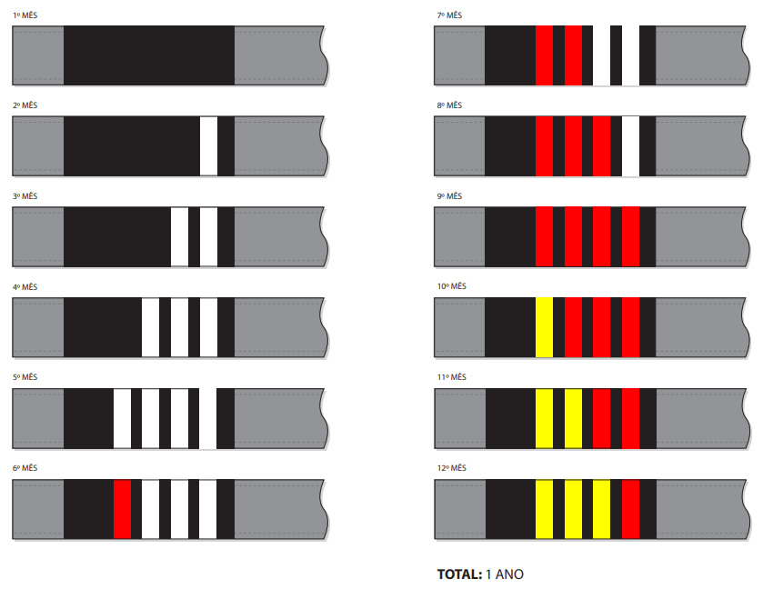 Para escolas que adotam a graduação a cada 4 meses, a IBJJF sugere 2 graus para cada faixa, sendo o 3º grau graduação à próxima faixa correspondente, conforme imagem abaixo.