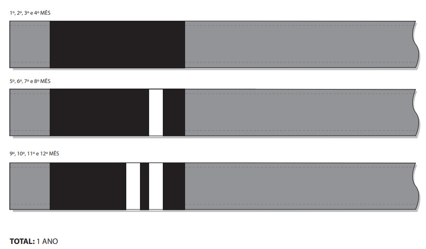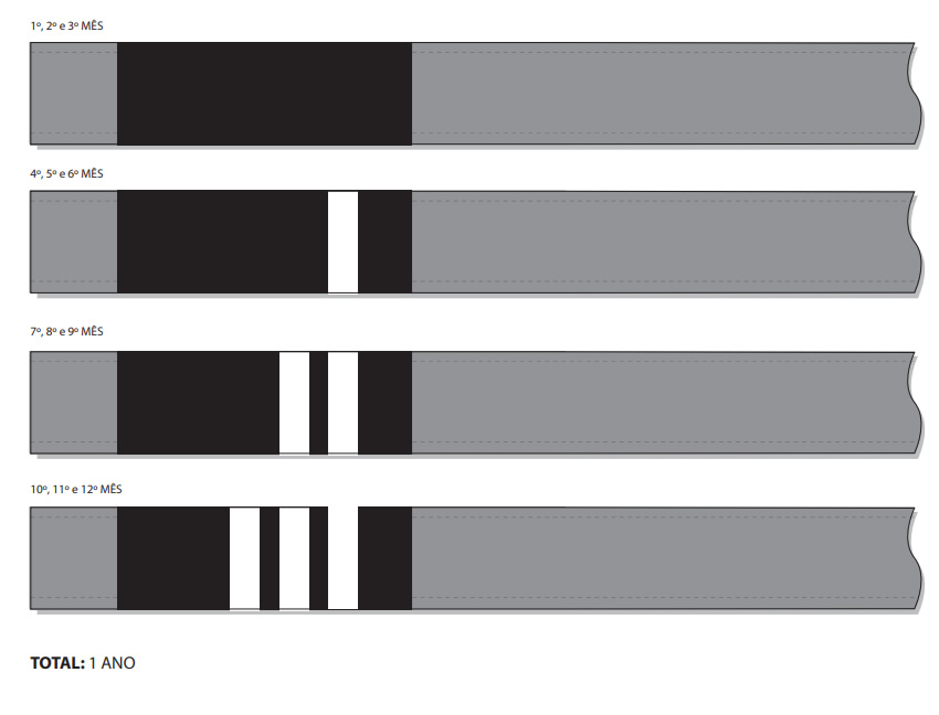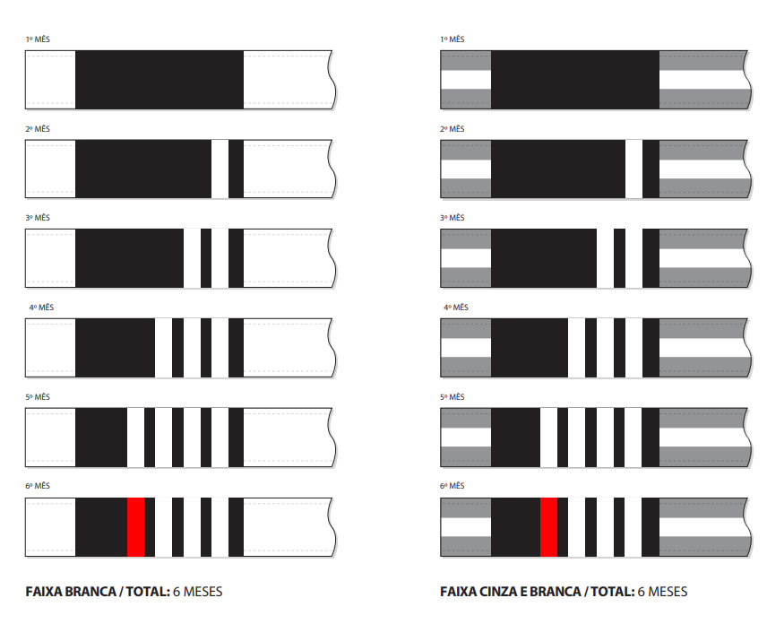 A IBJJF sugere 1 grau por mês nas faixas Branca e Cinza e Branca para que se complete o período de 1 ano nas duas graduações.